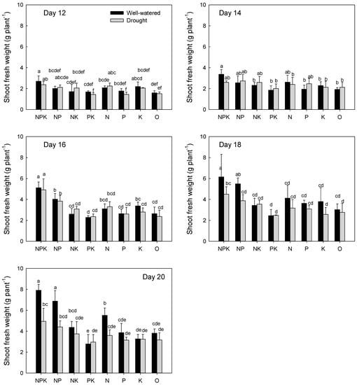 Interactive effects of drought and the N, P and K nutrients applied individually or in combination, or with no nutrient application (0) on the shoot fresh weight of the maize seedlings at days 12, 14, 16, 18 and 20 after sowing. The error bars represent the standard errors of the mean (n = 3) and fit within the plot symbol if not visible. Means accompanied by different letters are significantly different at p < 0.05.