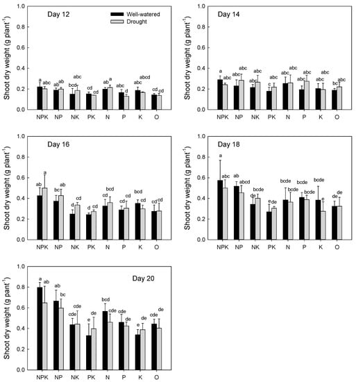 Interactive effects of drought and the N, P and K nutrients applied individually or in combination, or with no nutrient application (0) on the shoot dry weight of the maize seedlings at days 12, 14, 16, 18 and 20 after sowing. The error bars represent the standard errors of the mean (n = 3) and fit within the plot symbol if not visible. Means accompanied by different letters are significantly different at p < 0.05.