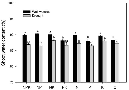 Nutrient supply increased shoot water content compared with no nutrient supply treatment, especially under well-watered conditions (Figure 5). For example, except for P and PK, N, K, NP, NK, NPK fertilization significantly increased the shoot water content compared with no nutrient supply under well-watered conditions, whereas, under drought stress, a significant increase in shoot water content was found for K, NK and NP treatments. The shoot water content was significantly reduced by drought stress for all nutrient treatments (Figure 5).