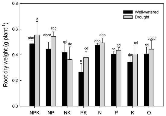 Interactive effects of drought and the N, P and K nutrients applied individually or in combination, or with no nutrient application (0) on the root dry weight of the maize seedlings at day 20 after sowing. The error bars represent the standard errors of the mean (n= 3) and fit within the plot symbol if not visible. Means accompanied by different letters are significantly different at p < 0.05.