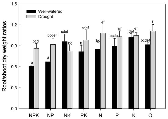 Interactive effects of drought and the N, P and K nutrients applied individually or in combination, or with no nutrient application (0) on the root/shoot dry weight ratios of the maize seedlings at day 20 after sowing. The error bars represent the standard errors of the mean (n = 3) and fit within the plot symbol if not visible. Means accompanied by different letters are significantly different at p < 0.05.