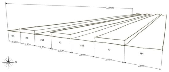 General layout of the experimental field indicating the soil surface shaping, with four flat areas (FS1–4) and three raised beds (R1–3). This is the innovative MITIORG organic long-term field experiment (Long-term climatic change adaptation in organic farming: synergistic combination of hydraulic arrangement, crop rotations, agro-ecological service crops and agronomic techniques), located on the research farm ‘Azienda Sperimentale Metaponto’ of the Council for Agricultural Research and Economics, Research Centre for Agriculture and Environment (CREA-AA) (Metaponto—MT, Italy; lat. 40°24′ N; long. 16°48′ E). 2,50 m = 2.50 m; 72,00 m = 72.00 m.