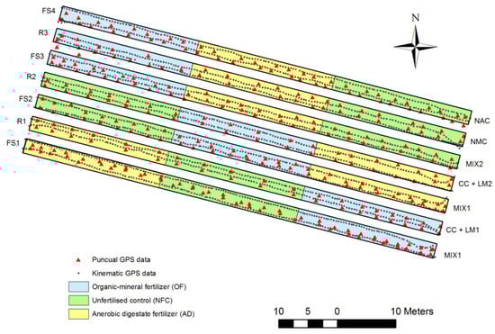 The experimental device with the sampling location based on a kinematic (black points) and punctual (red triangles) approach, along the four flat strips (FS) and the three ridges (R) split in the three different fertilizations. For each ridge, the cash crop (CC) was cultivated with different types of legume LM (LM1 and LM2) and with no living mulch control (NMC). For each FS, the ASC mixtures were cultivated (MIX1, MIX2) and a no ASC control (NAC) was also included.