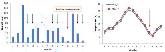 Mean monthly temperature and cumulative rainfall at the study site in the trial period (January 2016 and March 2017). The arrows indicate the date of the survey carried out in the FS (green arrows) and in the R (black arrows). The red arrow indicates the month of the extreme rainfall event.
