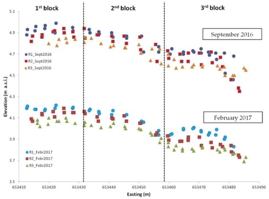 In the period before the extreme rainfall event (between May 2016 and September 2016) the differences were significant only for the R1. The lack of significant differences for the other Rs could indicate that, in the short-term and without particular thermo-pluviometric events (Figure 2), there were no changes in elevation in the experimental field and the differences may be due to instrumental errors []. In any case, the slight difference found in the first period in R1 could be due both to the absolute initial level which was the highest in R1 (Table 1) and to normal agronomical practices carried out in the spring-summer period that could influence soil loss.