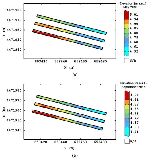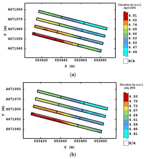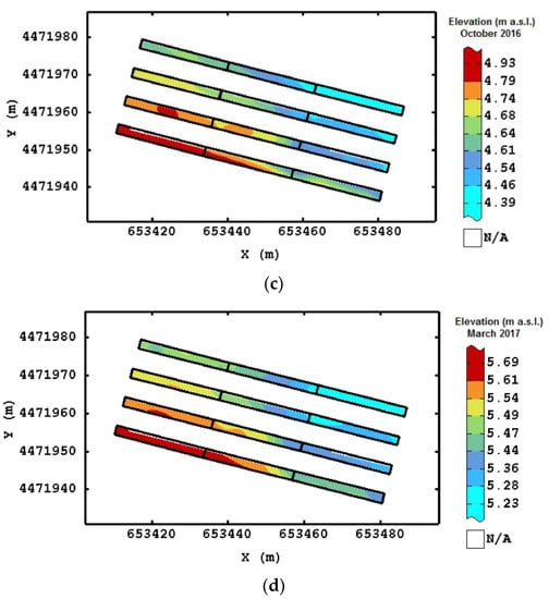 Figure 3 shows the monthly mean temperatures and the cumulative rainfall for the trial period (January 2016–March 2017). It can be observed that, before the first elevation survey (April 2016), the cumulative rainfall was 151 mm, whereas in the subsequent surveys, the rainfall was characterized by less intense events. The 48-h artificial extreme rainfall event represented about 15% of the annual rainfall recorded during 2016. After this water distribution, the cumulative rainfall of January 2017 was about 117 mm, which provided a second (although with less intensity) flooding. However, in the next two months (February and March 2017), the rainfall was low, with the possibility of reducing the effects of waterlogging. The mean temperature after the artificial extreme event was slightly lower than that in the previous winter period.