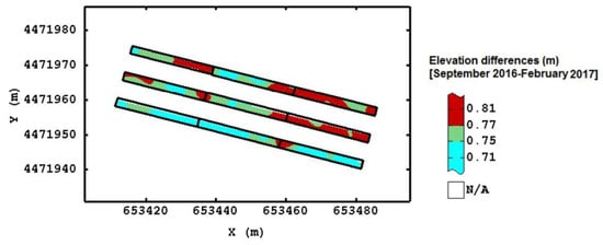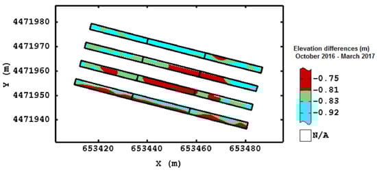 Since the difference was significant only for the surveying dates of October 2016 and March 2017, the elevation changes were calculated from subtraction of these two DEMs (Figure 9). The negative difference values indicated an increase of elevation in all plots; therefore, all FS increased. In particular, the central part of the FS2 and FS3 was characterized by the highest raising (or deposition of sediment), following the outflow line []. In the FS4, characterized by no-ASC, there was a more uniform increase of elevation in comparison with the other strips where the variability was higher. These results could also be due to the soil erosion that occurred in the R1 and R2, which were higher than R3; therefore, the rainfall event may be caused a different deposition of sediments. Furthermore, it should be pointed out that the FS4 is close to the R3, which is characterized by the absence of LM that could influence soil water balance and determine loss of sediment [].