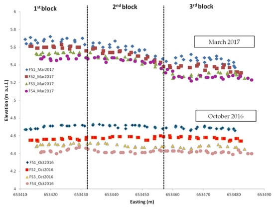 Figure 7 shows that before the event (in October 2016) the elevation values were uniformly distributed within each strip (on almost straight line) and a gradient was present from the first strip to the last one. In March 2017 (after the event), the elevation trend differed from that of October 2016 and it was very similar to the one observed for the ridges (Figure 3), maintaining the differences between the first and the last strip. Considering the absolute values of March 2017, the average height of the FS4, characterized by no-ASC control, underwent an increase of 2.6 cm more than the FS1. From an agronomical point of view, this result suggests that the repeated strong rainfall events could create or increase a soil slope which could influence the level and stability of yield production [].