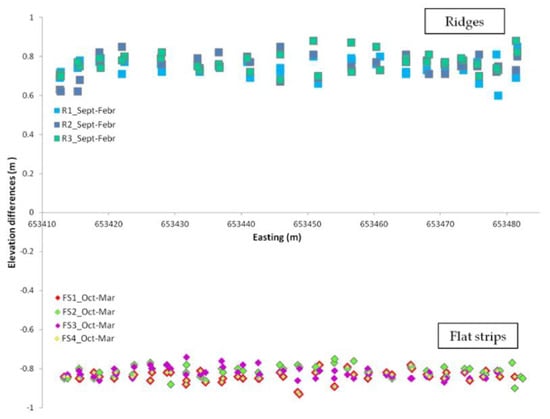 In Figure 10 the elevation difference of each ridge and flat strip is reported, showing that in the R there was higher variability, while in the FS the variation of elevation appeared more uniform. In addition, the figure highlights that the reduction of altitude (or soil loss) in the R was recovered in the FS: all values were allocated in the same range (0.6–0.8 m for the R and from −0.6 to −0.8 m for the FS).