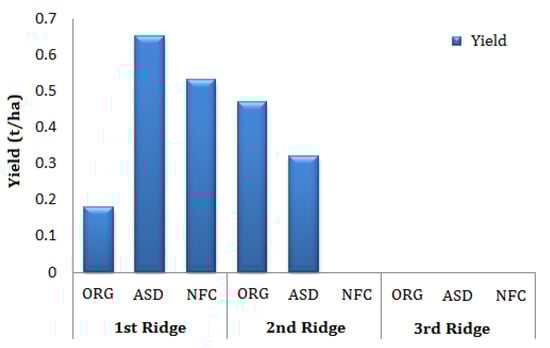 Because crop yields may be sensitive to extreme soil water contents [], to evaluate the effect of the artificial rainfall event on the yield in the ridges, cash crop yield was determined. Cauliflower marketable yield results showed that crop production was obtained only in the first two ridges (Figure 11). By contrast, in the R3, characterized by absence of mulching and by the highest soil loss, there was no production. In particular, this result could be due to both a higher flooding and a lower soil fertility. This latter aspect could be due to the absence of leguminous cover corps (burr medic and crimson clover) and/or the organic amendments, which generally reduce crop productivity []. In particular, after the extreme rainfall event, the R3 remained flooded for a longer time period (about 3–4 days) as compared to the R1 and R2, which were characterized by waterlogging of about 2–3 days. Furthermore, the natural rainfall that occurred in January 2017 (117 mm) induced a further stress in the cauliflower plants, with a higher influence in R3.