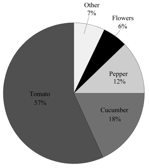 In this region, greenhouses grow a variety of crops, and with each crop comes a unique demand profile. Figure 1 shows the crop breakdown by area, with the water utility servicing over 720 hectares of greenhouse operations. It can be recognized that more than half of the total area (57%) is used for growing tomatoes. Examining the remaining crops shows that tomatoes, peppers, and cucumbers account for almost 90% of the water demand, with the remainder being used by other crops such as flowers, plugs, and various other specialty products. Current estimates for water usage are shown in Table 1. It can be observed that there is a large variation in water usage estimates between greenhouse operations, with the largest coming from flower growers. This variation in water requirements between crops makes it difficult to develop one forecasting model to reliably predict the industry demand. This research is conducted to evaluate the suitability of a simplified forecasting method that would accompany a more complex method involving external determinates of demand such as neural network models. This is done by evaluating crop watering data, in this case tomato and pepper crops, and looking for similarities in watering strategies that would allow the water demand of one crop (e.g., peppers) to be predicted using only another crop’s usage data (e.g., tomatoes). This crop-to-crop (C2C) forecasting method would utilize data generated by a much more complex and specialized demand-forecasting model that would be developed and optimized for one crop, and in this case it should be developed for the tomato crop as it accounts for almost 60% of the land use. The simplified forecasting method would save on expenses related to developing and maintaining several more complex models and would also address the concerns of [1] regarding model simplicity and practicality. The two crops chosen for this study were tomatoes and peppers, which account for 69% of total greenhouse land use. These two crops were also chosen due to their similar range in current demand estimates as seen in Table 1, it follows then that they would potentially have the highest probability of similar demand patterns.