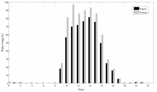 Comparing water volume is not the only aspect that will impact the effectiveness of C2C forecasting. Time of use (time of day and time of year) could arguably have more impact on C2C forecasting than volume as C2C relies strictly on one crops time-series watering data to prepare forecasts. If the watering times are not similar C2C cannot be effective. To determine the similarities in daily watering times, Figure 3 was developed showing total water usage for each hour encompassing the entire dataset. Figure 3 shows that the vast majority of watering occurred between hours 9 and 19. This pattern held true for both crops, showing sharp increasing water usage between hours 9 and 10, with more incremental increase up until hour 14 where water usage begins to decline. It can be noticed that during hour 11, the water usage for tomatoes increased substantially to its maximum level and reduced during hour 12, after which it increased until hour 14 but did not reach the same usage level that was attained during hour 11. This deviation could have an impact on C2C forecasts, but since it only occurred during one hour with the remaining hours following the same pattern, the effects should be minimized.