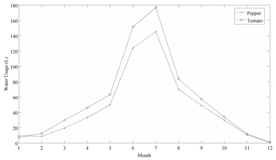 To examine both crops seasonal water usage trends Figure 4 was developed. This figure shows the monthly water usage for both crops for the entire dataset. Examination of Figure 4 shows a distinct pattern in water usage, starting with low use at the beginning of the year with a steady increase until usage peaked at month 7 (July), after which there was a sharp decline in usage for the remainder of the year. This pattern was consistent for both crops, with tomatoes having a larger magnitude. The most noticeable feature in this yearly pattern is the sharp increase in water usage between months 5 and 6 (May and June), and the sharp decrease in usage between months 7 and 8 (July and August), which was consistent for both crops. These increases in crop watering during these summer months (June to August) could be attributed to the higher levels of solar radiation and elevated outdoor temperatures which have been shown to have a major impact on pepper water consumption [15] along with the United Nations study [16] which show that solar radiation has the largest effect on evapotranspiration rates of various crops.