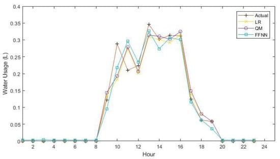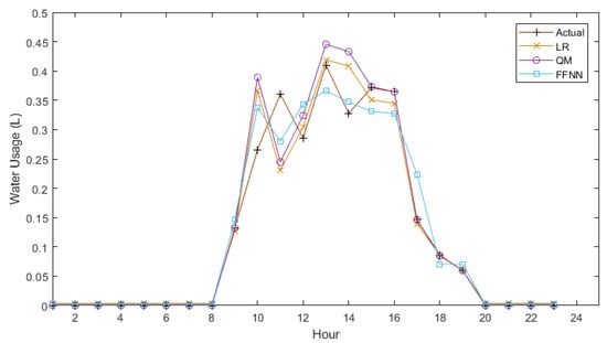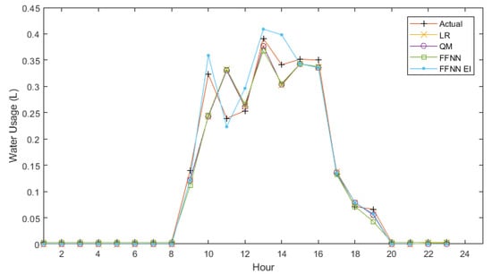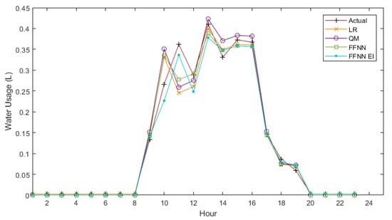 The results of day-ahead forecasts for each model are displayed in Figure 5 and Figure 6. The daily pattern can be observed, with all watering taking place between hour 8 and hour 20. All forecast methods were able to determine these start and stop times, with no spike in usage occurring before or after the actual start and stop hours. One issue that was noticed was the inability of the LR model to forecast zero usage points. As shown in Equations (6) and (7), the LR model produced a minimum of 4.52 × 10−3 L when forecasting tomato usage and 1.28 × 10−6 L when forecasting pepper usage. The LR model was not the only model to have issues forecasting zero usage data; the FFNN and FFNN_EI models also did not forecast zero, but for each instance, forecasted values ranged from 3.81 × 10−3 L to 1.01 × 10−4 L. This issue could cause difficulty when the forecast is extrapolated over the millions of plants in the region. The QM however, was able to forecast the zero usage periods as they occurred during the same times for both crops. Examining both figures shows how similar the two crops watering schemes are. The differences in watering times become apparent in the forecasts during hour 9 and 11, which show peaks occurring at opposite times for each crop. This is where the majority of the difference in forecasts occurs. The forecast for tomatoes followed the same pattern as the actual usage data for peppers, except at a higher magnitude, and the same applied to the pepper forecasts, as they resembled actual tomato usage. This applies to all C2C models, but not the FFNN_EI model. One notable feature in Figure 6 is how close each of the forecasting methods is compared to those in Figure 5. Examining the results of the FFNN_EI model showed better adherence to the actual usage data, particularly during the peaks in usage occurring at hour 11 for tomatoes and hour 10 for peppers, where the other models struggle.