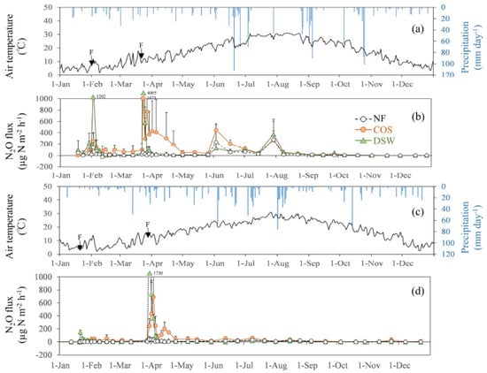 Seasonal variation in air temperature and precipitation in 2013 (a); and 2014 (c); soil N2O fluxes in 2013 (b); and 2014 (d) in no fertilizer (NF), combined organic and synthetic fertilizer (COS), and distilled silage waste (DSW) treatments in a citrus orchard in southwestern Japan. Error bars represent standard deviations. F denotes fertilization.