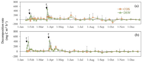 Decomposition rate of applied organic materials was defined as the differences in CO2 flux between NF and COS or DSW treatments [,].