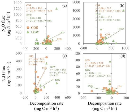 Relationships between soil N2O flux and decomposition rate of applied organic materials in the season after basal fertilization (a); after supplemental fertilization (b); in summer (c); and in other seasons (d) in 2013 and 2014 in no fertilizer (NF), combined organic and synthetic fertilizer (COS), and distilled silage waste (DSW) treatments in a citrus orchard in southwestern Japan.