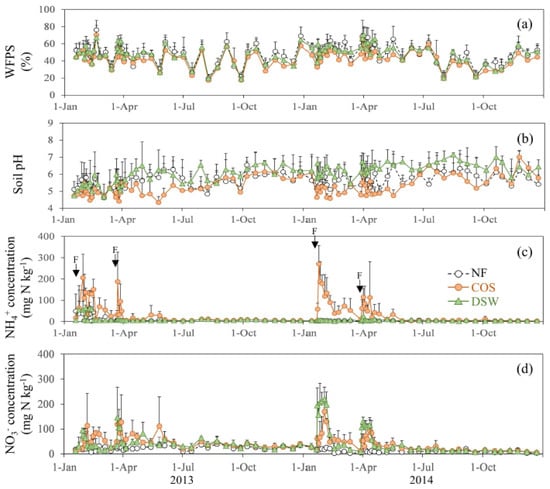 Seasonal variation in water-filled pore space (WFPS) (a); soil pH (b); NH4+ (c); and NO3− (d) concentrations during the study period in no fertilizer (NF), combined organic and synthetic fertilizer (COS), and distilled silage waste (DSW) treatments in a citrus orchard in southwestern Japan. Error bars represent standard deviations. F denotes fertilization.