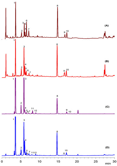 Representative HPLC-DAD chromatograms of the apricot leaves during maturation at 320 nm. (A) 15 days; (B) 30 days; (C) 45 days; and (D) 60 days. The identification of the peaks are given in Table 1.