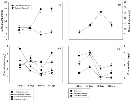 Changes in the polyphenolic compounds of apricot leaves during maturation. (A) 3-O-Caffeoylquinic acid, quercetin-3-glucoside; (B) 5-O-Caffeoylquinic acid; (C) 4-O-Caffeoylquinic acid, hydroxyferuloyl glucose, p-coumaric acid derivative; and (D) caffeic acid, kaempferol hexoside, and laempferol derivative. Significant levels are mentioned in the text.