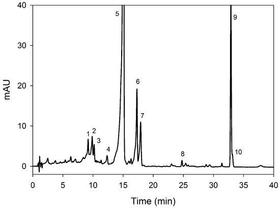 Representative HPLC-DAD chromatograms at 450 nm of carotenoids of the apricot leaves. Numbers above the peaks represent individual compounds with details given in Table 2.