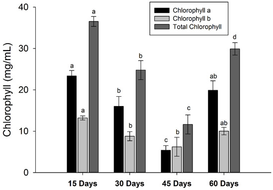 Changes in the pigment contents of the apricot leaves during maturation. Different letters (a–d) in each column represent significant differences at p < 0.01 (Tukey’s test).