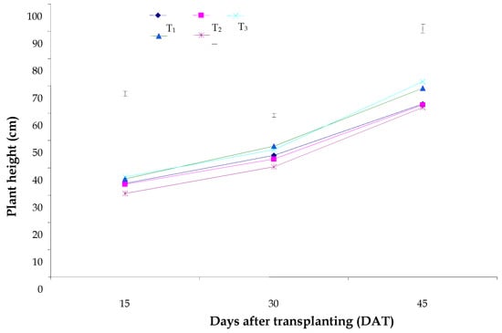 Effect of fertilizer treatments on plant height on different days after transplanting (DAT). Vertical bars represent Least Significant difference (LSD) at 1% level of probability. T1 = Vermicompost, T2 = Compost, T3 = Integrated plant nutrient system (IPNS) (organic 2/3 + inorganic 1/3), T4 = Inorganic fertilizers, T5 = Control.