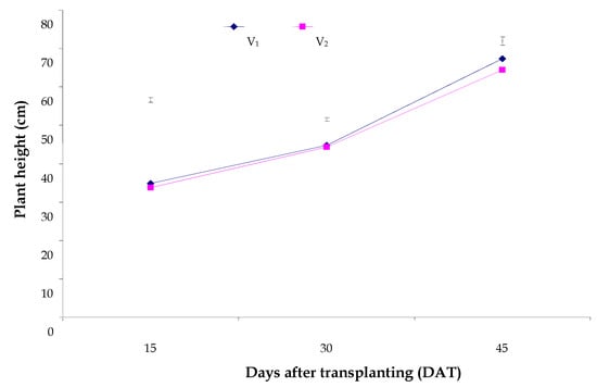 Plant height of two tomato varieties on different days after transplanting (DAT). Vertical bar represents LSD at 1% level of probability (V1 = Roma VF and V2 = BARI tomato 15).