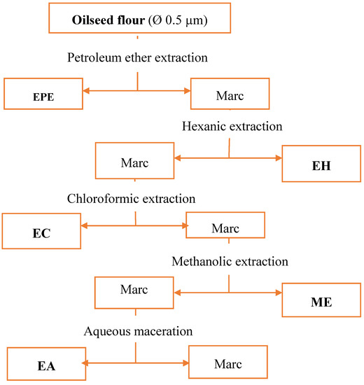 Flour (Ø 0.5 µm) obtained from grinding of the dried seeds (30 g) was mixed with 300 mL of solvent, and put in a Soxhlet apparatus (Fisherbrand NS29//NS45 32/40, Fischer, Strasburg, France) [8]. Extractions were successively performed using the following order of organic solvents: petroleum ether, hexane, chloroform, and methanol. After a decoction for 2 h, the extracts were filtered using a Whatman paper. After pooling, the extracts were concentrated using rotary evaporator (Buchi Rotavapor R200), coupled with a vacuum pump at 60 °C. The diagram of extraction steps are summarized in Figure 1.