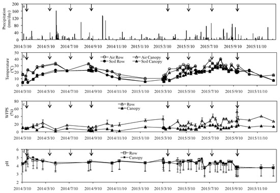Precipitation occurred intensively during June to September in both years, and the annual precipitation was 814 mm in 2014 and 829 mm in 2015 (Figure 1a). During the hot season (June–September), the mean air temperature was 28.0 °C and the mean soil temperature was 22.7 °C. In the other seasons the mean air temperature was 19.6 °C and 11.9 °C. The highest and lowest air temperatures were 40.1 °C on 7 August and 10.4 °C on 10 March, respectively (Figure 1b). Both soil and air temperatures were higher in rows than under the canopy. The mean WFPS was 20.2% in the soil of the rows and 9.8% in the soil under canopies. The WFPS under the canopy was lower than that of the rows. It started to increase from May until August, and was especially higher in the rainy season in 2015. The WFPS of rows was higher than under the canopies, but not significantly different in both 2014 and 2015. Those of rows were 13.5% and 23.6% in 2014 and 2015, respectively, and 11.4% and 6.5% under the canopies in 2014 and 2015, respectively. The WFPS of both rows and canopies in 2014 were lower than in 2015. Soil pH values in the soil under the canopy was higher than that of soil in the rows from the beginning of the experiment until spring fertilization in 2015, and they were not significantly different (Figure 1d).