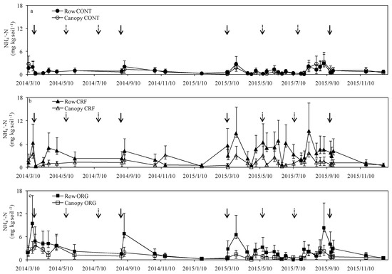 Figure 2. Time course of (a) NH4+-N in rows and under the canopy in CONT: no significance (p > 0.05); (b) NH4+-N in rows and under the canopy in CRF: significant difference (p < 0.05); and (c) NH4+-N in rows and under the canopy in ORG: significant difference (p < 0.05). Solid arrows and dotted arrows represent fertilization and tea harvest time, respectively.