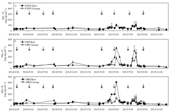 Figure 3. Time course of (a) NO3-N in rows and under the canopy in CONT: no significant difference (p > 0.05); (b) NO3-N in rows and under the canopy in CRF: significant difference (p < 0.05); and (c) NO3-N in rows and under the canopy in ORG: no significant difference (p > 0.05). Solid arrows and dotted arrows represent fertilization and tea harvest time, respectively.