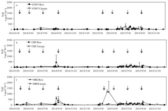 Figure 4. N2O emission from soil in rows and under the canopy. (a) CONT treatment: significant difference (p < 0.05); (b) CRF treatment: significant difference (p < 0.05); and (c) ORG treatment: significant difference (p < 0.05). Solid arrows and dotted arrows represent fertilization and tea harvest times, respectively.