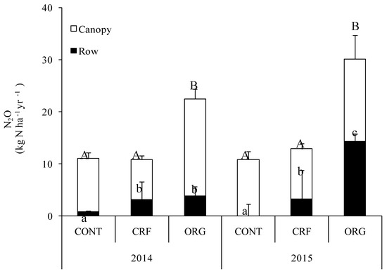 In 2014, the cumulative amounts of N2O from soil under the canopy were significantly higher in ORG treatment than that of CONT and CRF treatments (Figure 5). Cumulative N2O emission from the soil in rows was significantly lower in CONT than that of the two fertilized treatments. In 2015, the cumulative N2O emission from soil under the canopy was significantly higher in ORG treatment than that of CONT and CRF treatments, cumulative N2O emission from soil in rows in CRF was significantly higher than that in CONT treatment and significantly lower than that in ORG treatment.