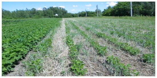 Organic tilled (left) and no-till (right) soybeans on 12 July 2007 at Les Cèdres, Québec. Reproduced with permission from Estevez, 2008 [13].