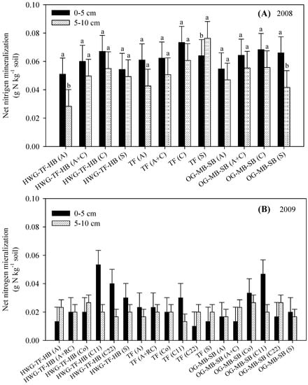Soil net nitrogen mineralization as influenced by different grasses and nitrogen treatments for 2008 (A) and 2009 (B) at 0–5 and 5–10 cm soil depths. Grasses: HWG-TF-HB = Hybrid Wheatgrass-Tall Fescue-Hybrid Brome; TF = Tall Fescue; and OG-MB-SB = Orchard grass-Meadow Brome-Smooth Brome. Nitrogen sources: A = alfalfa; A + C = combination of alfalfa + composted dairy manure at 22 Mg ha−1; A + RC = combination of alfalfa + residual composted dairy manure; Co represents no composted dairy manure; C11 = composted dairy manure at 11.2 Mg ha−1; C22 = composted dairy manure at 22.4 Mg ha−1; and S = sainfoin. The different lowercase letters represent significant differences between the depths studied within each year (p < 0.05). Error bars represent the standard error of the mean.