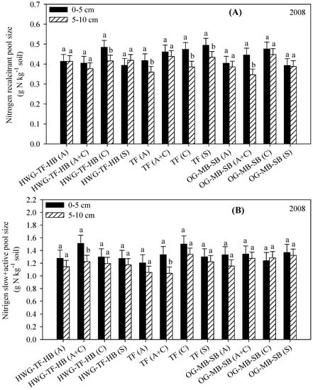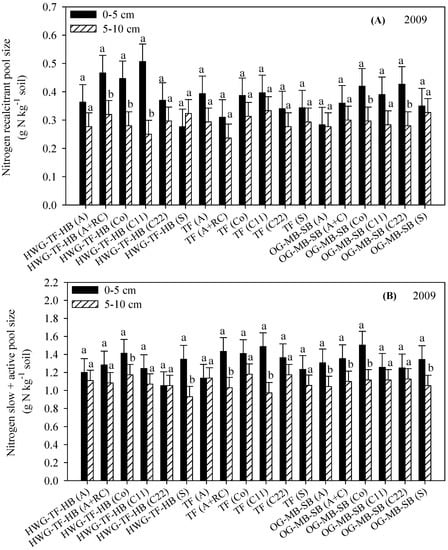 The 2009 soil recalcitrant nitrogen pool (A), and the combination of slow + active nitrogen pools (B) influenced by different grasses and nitrogen treatments at 0–5 and 5–10 cm depth. The HW-TF-HR represents Hybrid Wheatgrass-Tall Fescue-Hybrid Brome; TF represent Tall Fescue grass; OG-MB-SB represents Orchard grass-Meadow Brome-Smooth Brome. The nitrogen sources were (A) represent alfalfa (legume); (A + RC) represents the combination of alfalfa + residual compost dairy manure; (Co) represents no compost addition; (C11) represents compost dairy manure addition at 11.2 Mg ha−1; (C22) represents compost dairy manure addition at 22.4 Mg ha−1, and (S) represents Sainfoin (legume). The different lowercase letters represent significant differences between depths within each treatment and nitrogen pool (p < 0.05). The active + slow N (Na+s) fraction was influenced by depth but not by treatment in both years (Figure 2B and Figure 3B). A significantly higher Na+s fraction was observed in the 0–5 cm depth compared with the 5–10 cm depth due to no tillage practice and a lack of soil disturbance after the CDM addition. The magnitude of the difference in the Na+s fraction between depths was approximately 2-fold higher in 2009 compared with 2008. The greater differences in the Na+s fraction between the study periods were again related to the continuous surface CDM addition, three CDM additions before 2009, compared with two CDM additions before the 2008 sampling.