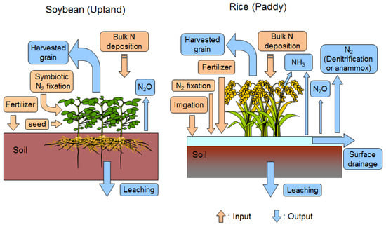 Outline of major nitrogen (N) flows in soybean upland field and rice paddy field. Anammox, anaerobic oxidation of ammonium; NH3, ammonia volatilization; N2, dinitrogen; N2O, nitrous oxide. N2 emission via denitrification in upland was not considered in this study.