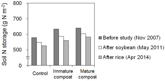 Generally, loss of soil organic matter in paddy fields are considered to be lower than those in upland fields owing to slow decomposition under flooded and anaerobic condition [34,35]. In this study, however, soil nitrogen storage decreased not only during the upland soybean cultivation period but also during the flooded rice cultivation period, though the decreases during the rice cultivation period were relatively lower than those during the soybean cultivation period (Figure 2, Table S1). Soil layers that decreased their nitrogen storage were different between the periods. During the soybean cultivation period, obvious decrease in soil nitrogen storage occurred at 0–10 cm (surface soil) in both compost application plots where their nitrogen storage increased owing to preceding compost application. On the other hand, soil nitrogen storage at 0–10 cm in the control plot did not decrease during the soybean cultivation period. Nitrogen loss caused by organic matter decomposition might be compensated by nitrogen supply such as litter, harvesting residue, and rhizodeposition (e.g., [36]) from soybean and so on. During the rice cultivation period, soil nitrogen storage at 0–10 cm in all plots did not decrease or slightly increased, and the tendency agreed with previous knowledge on organic matter in flooded paddy soil [34,35]. Although the reason for decrease in soil nitrogen storage at 10–30 cm (subsoil) was not identified clearly, it might be caused by enhancement of organic matter decomposition under aerobic condition [35] owing to the presence of subsurface drainage and increase in uptake of soil nitrogen by rice due to greater root activity and expansion of the effective soil layer (i.e., root zone) to the subsoil after conversion to upland [37,38].
