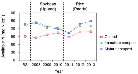 Before soybean and rice cultivation, available soil nitrogen in the immature and mature compost plots were almost 40 mg N kg−1 higher than that in the control plot (Figure 3). The available soil nitrogen in the control plot was almost steady around 90–100 mg N kg−1 during the soybean cultivation period. While, although the available soil nitrogen in both compost application plots decreased during the soybean cultivation period, the values were still 20 mg N kg−1 higher than in the control plot. The available soil nitrogen in all plots decreased after the first year of rice cultivation (2011) and tended to increase during the second and third years (2012 and 2013). After the six-year experiment, the available soil nitrogen contents in the immature and mature compost plots (131 and 149 mg N kg−1) were still 22 and 40 mg N kg−1 higher than in the control plot (109 mg N kg−1), respectively.
