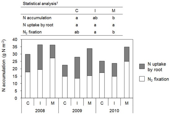 Amount of nitrogen (N) accumulation in soybean plant (cultivar: Ryuho) derived from dinitrogen (N2) fixation and nitrogen uptake by root at harvesting stage for three years. † Different alphabets within a same line indicate significant difference among the plots (Two-way ANOVA (Year × Plot) followed by Tukey test, p < 0.10). C, control; I, immature compost; M, mature compost.