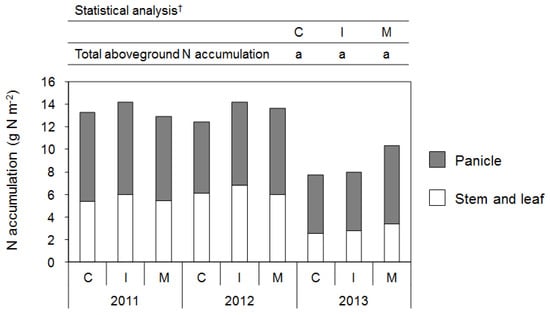 Amount of nitrogen (N) accumulation in rice plant (panicle or stem and leaf) at the harvesting stage for three years. Rice cultivar was Yumeobako (2011) and Akitakomachi (2012 and 2013). In 2013, rice plants were damaged severely by insects biting. † Different alphabets within a same line indicate significant difference among the plots (Two-way ANOVA (Year × Plot) followed by Tukey test, p < 0.10). C, control; I, immature compost; M, mature compost.