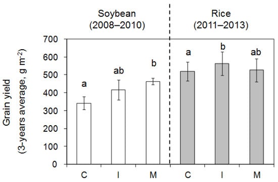 Effect of preceding compost application on the grain yield of soybean and rice (brown rice). Cultivar for soybean was Ryuho and for rice was Yumeobako (2011) and Akitakomachi (2012 and 2013). All yields were expressed on a 15% moisture content basis. Different alphabets within a same crop indicate significant difference in each nitrogen source among the plots (Two-way ANOVA (Year × Plot) followed by Tukey test, p < 0.10). C, control; I, immature compost; M, mature compost.