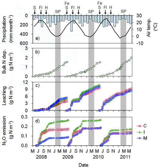 Seasonal changes in: monthly air temperature (line) and precipitation (bars) (a); bulk nitrogen deposition (b); leaching (c); and N2O emission (d) during the soybean cultivation period (upland). All nitrogen flows were shown as cumulative values. C, control; Fe; Fertilizer application; Fl, flowering stage; H, harvesting; I, immature compost; M, mature compost; S, sowing; SP, snow period.