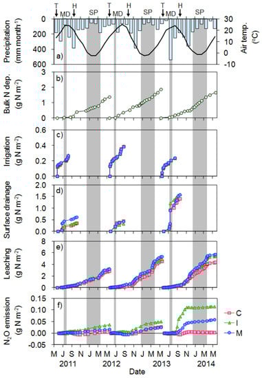 Seasonal changes in: monthly air temperature (line) and precipitation (bars) (a); bulk nitrogen deposition (b); irrigation (c); surface drainage (d); leaching (e); and N2O emission (f) during the rice cultivation period (paddy). All nitrogen flows were shown as cumulative values. C, control; H, harvesting; I, immature compost; M, mature compost; MD, Mid-season drainage; SP, snow period.