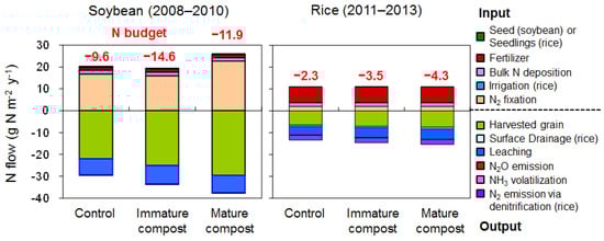 Following our previous report [8], loss of nitrogen from the soybean-cultivated upland field was quantified (Figure 9). The amount of nitrogen loss in both compost application plots tended to be higher than that in the control plot due to greater nitrogen output via harvested grain. The amounts of nitrogen loss during the soybean cultivation period estimated by the nitrogen budget agreed well with those estimated based on changes in soil nitrogen storage (Figure 10), suggesting validity of the nitrogen budget estimation in this study. Nitrogen loss during the soybean cultivation period in this study (9.6 to 14.6 g N m−2 year−1) was greater than that estimated during the soybean cultivation period in a rotational field in Shiga Prefecture (3.95 g N m−2 year−1) [9]. This difference might be due to the difference in soybean yield between the sites and inclusion of nitrogen leaching during the fallow season in our estimates.