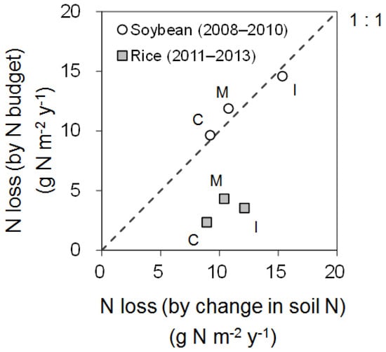 Nitrogen loss during the rice cultivation period (2.3 to 4.3 g N m−2 year−1) was lower than those during the soybean cultivation period (Figure 9). The N loss in this study was higher than reported previously (e.g., +1.28 g N m−2 in [11], +0.4 g N m−2 in [10]). As described above, uptake of soil nitrogen by rice in paddy fields converted from upland fields could be larger than those in unconverted paddies [31,32]. To avoid over-luxuriant growth and lodging due to the increased nitrogen uptake, nitrogen fertilization to paddy fields converted from upland fields is limited. In Akita Prefecture, it is recommended that basal nitrogen fertilization decrease by 100% and by 50%–70% in the first and second years after conversion, respectively [15]. Because the amount of nitrogen fertilization accounted for large part of nitrogen input in paddy fields (67% for three years average in this study) strongly influenced on the nitrogen budget. Therefore, nitrogen loss from the paddy fields in this study could be higher than those in previous reports and especially higher in the first year after conversion (Table S8). Unlike in the case of soybean, the nitrogen loss during the rice cultivation period estimated based on the nitrogen budget did not agree with that estimated by changes in soil nitrogen storage (Figure 10), suggesting underestimation of nitrogen loss in this study. This difference might be caused by uncertainty in the estimation of nitrogen output via NH3 volatilization or N2 emission via denitrification. Especially, it is well known that estimated values N2 emission via denitrification show large variation as described by Katayanagi et al. [11]. Consequently, in the paddy–upland rotation system with rice and soybean cultivation, significant nitrogen loss may occur not only in the soybean cultivation period but also in the rice cultivation period.