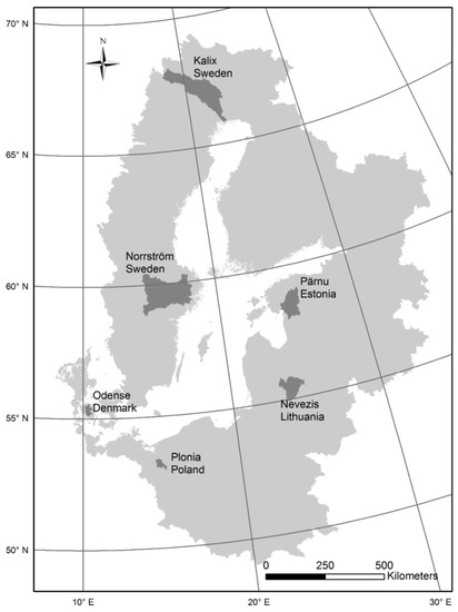 The six type catchments included in this study were: River Kalix, representing the boreal forested northern catchments: River Pärnu, Estonia, and River Nevezis, Lithuania, representing the eastern catchments with both forest and medium intensity agriculture; the Norrström catchment (only including the land area and thus not Lake Mälaren), Sweden, representing the eastern Swedish catchments with both agriculture (medium-high intensity), forest and urban areas; River Plonia, Poland, representing the high intensity agricultural southern catchments; and River Odense, Denmark, representing the high intensity agricultural catchments in the south-western part of the Baltic Sea basin. The combined area of the six pilot catchments was about 55,000 km2, i.e., approximately 3% of the total Baltic Sea catchment area. The six type catchments represented ranges in climate, land use, and agricultural practices (Table 1).