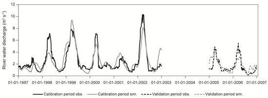 The time series of observed and simulated river water discharge for both the calibration and the validation period are shown for the River Plonia in Figure 2 by way of example.