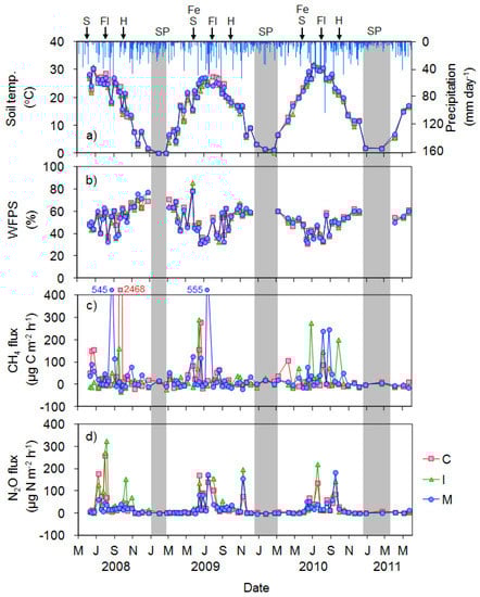 Seasonal changes in (a) soil temperature and precipitation (bars); (b) water filled pore space (WFPS); as well as (c) methane (CH4) and (d) nitrous oxide (N2O) fluxes during the soybean cultivation period (upland). Positive flux values indicate emission to the atmosphere and negative indicate uptake from the atmosphere. C: control; Fe; Fertilizer application; Fl: flowering stage; H: harvesting; I: immature compost; M: mature compost; S: sowing; SP: snow period (gray area).
